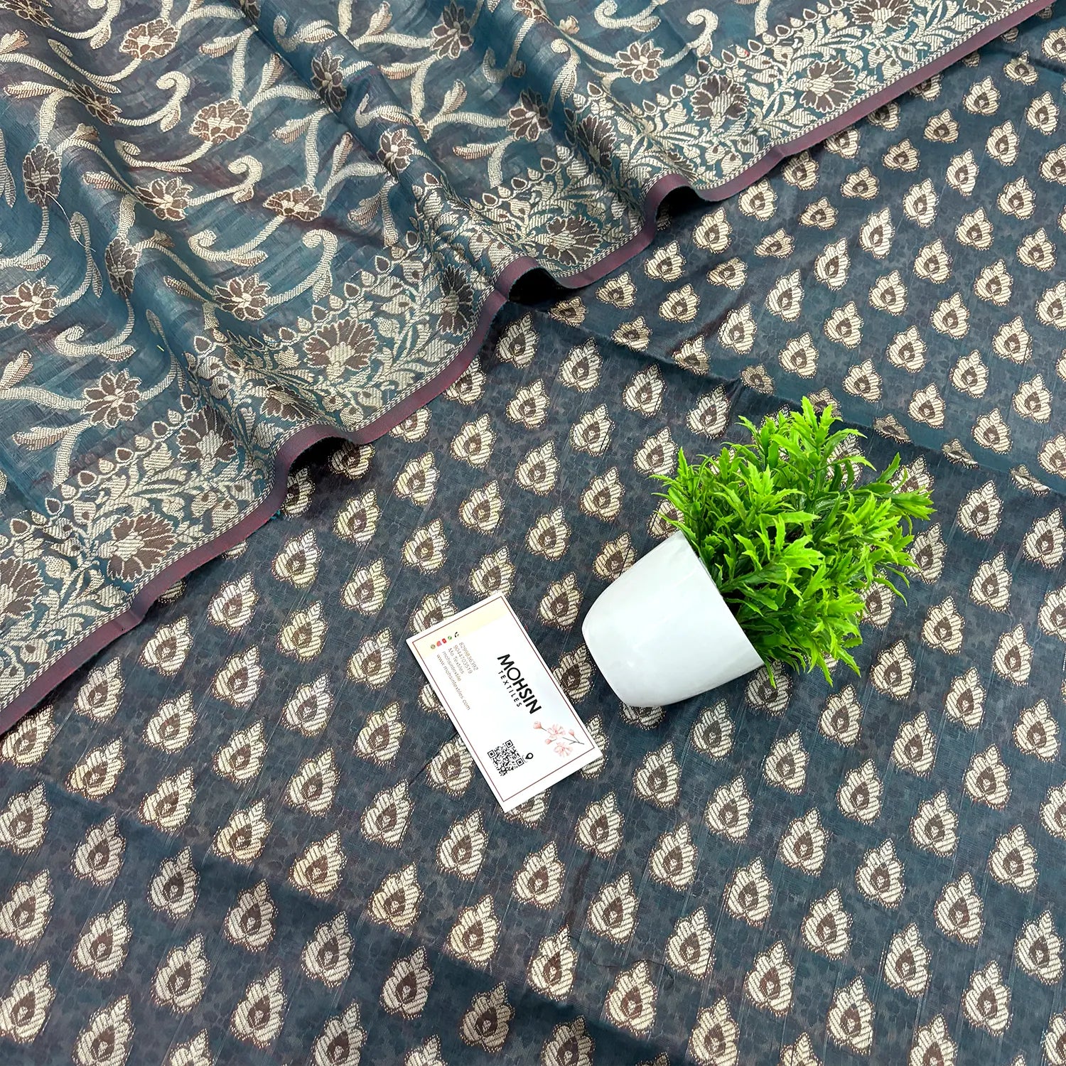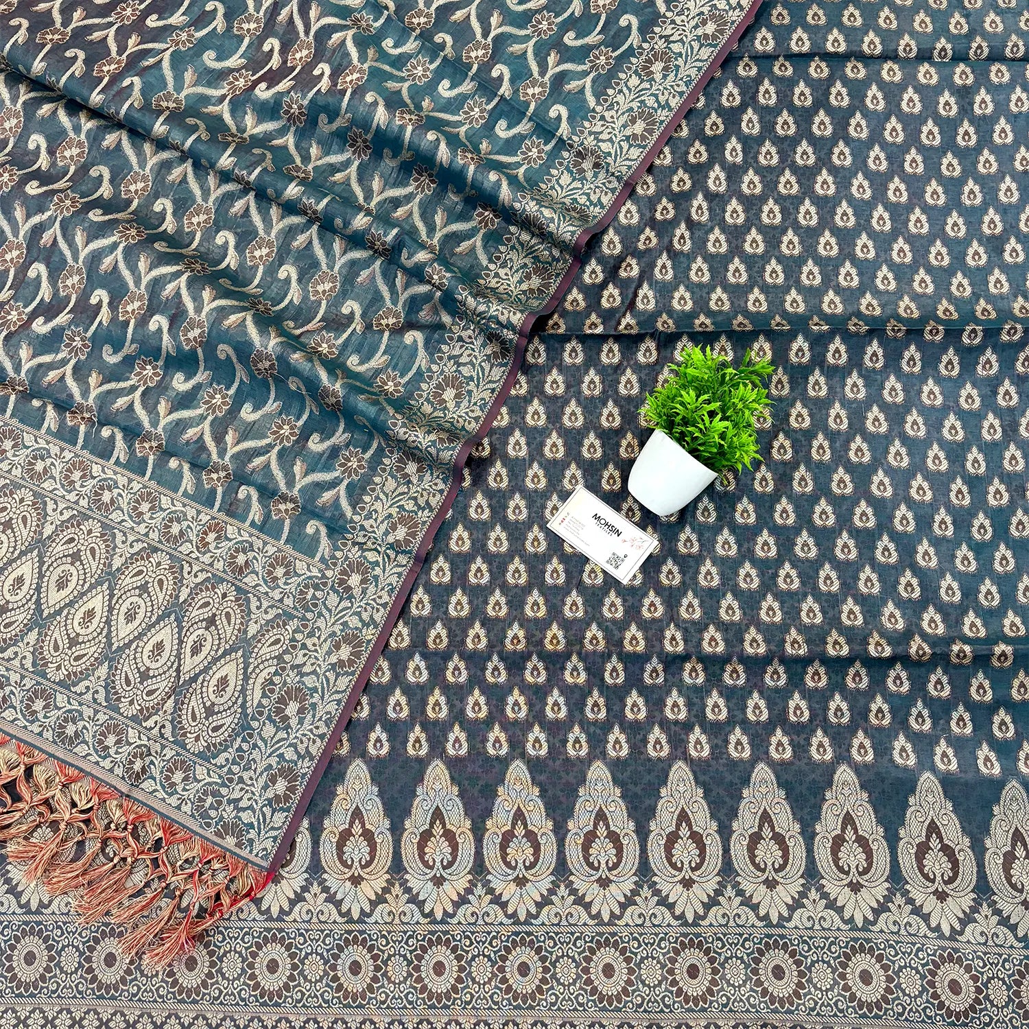 Greyish Firozi Yoga Jaal Cotton Silk Banarasi Suit
