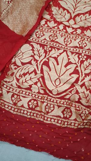 Banarasi Khaddi Chiffon Lahenga Pure Silk with Bandhni (Full Kalli 12 Pcs.) Red-Pink Lahenga / Red-Pink Dupatta