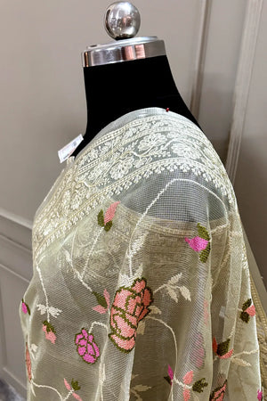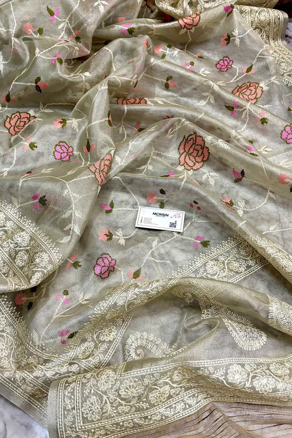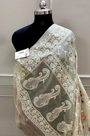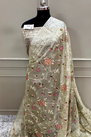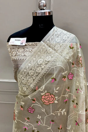 This Beige Embroidery Tissue Silk Banarasi Saree is the epitome of elegance and sophistication. Made from high-quality silk and adorned with intricate embroidery, this saree is perfect for any occasion. Its delicate material and stunning design are sure to make you stand out.