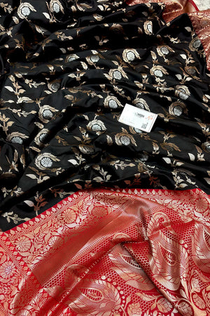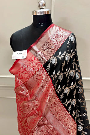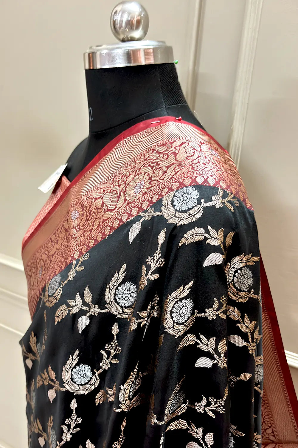This Black and Red Banarasi Silk Saree blends traditional craftsmanship with luxurious silk and intricate golden zari work. Ideal for festive and formal occasions, it offers timeless elegance and rich texture, reflecting expert artistry in every detail.