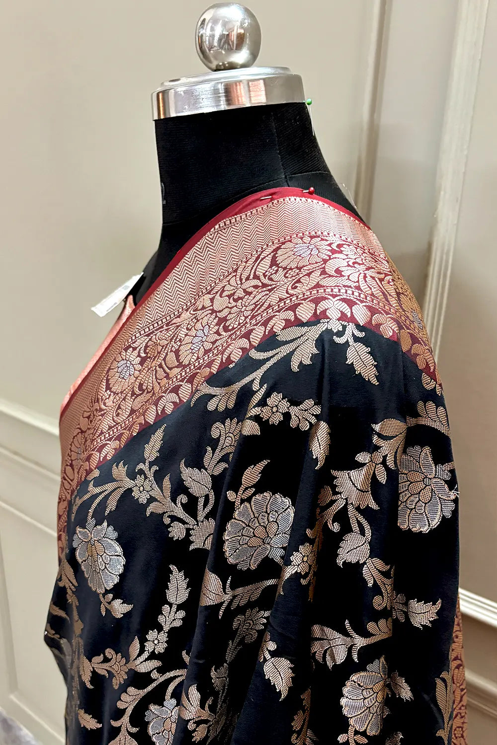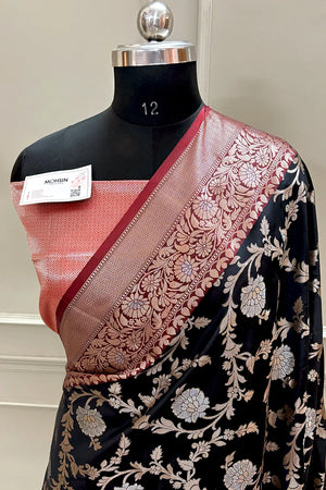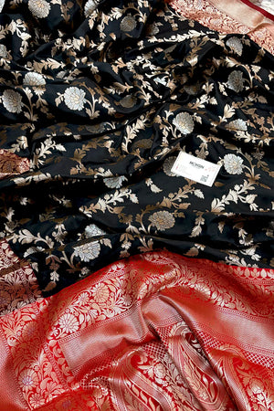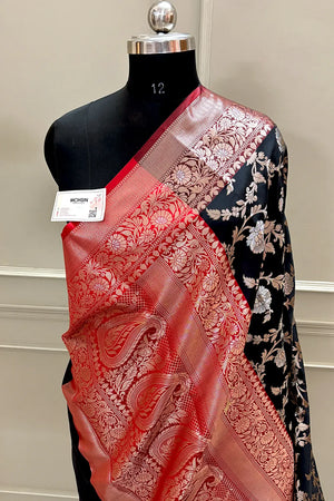 This Black and Red Banarasi Silk Saree blends traditional craftsmanship with luxurious silk and intricate golden zari work. Ideal for festive and formal occasions, it offers timeless elegance and rich texture, reflecting expert artistry in every detail.