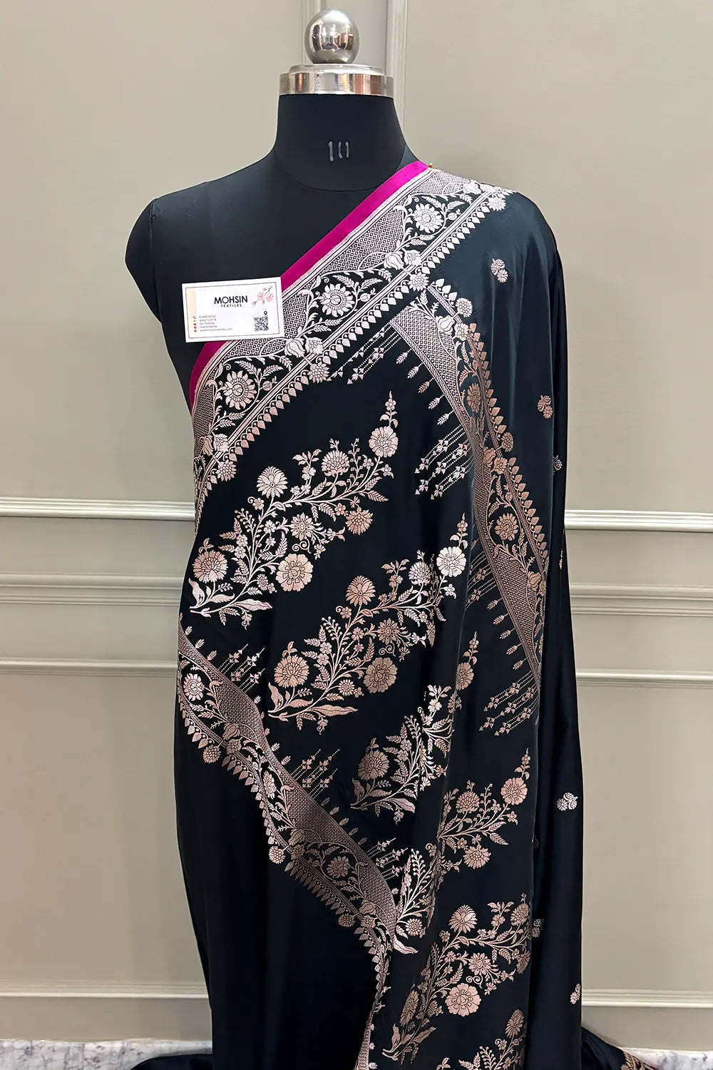 Turn heads with our Black Babri Buti Katan Silk Banarasi Saree! Made with luxurious silk and adorned with intricate babri buti designs, this saree is perfect for any occasion. Elevate your style and exude elegance with this stunning piece. Upgrade your wardrobe today!