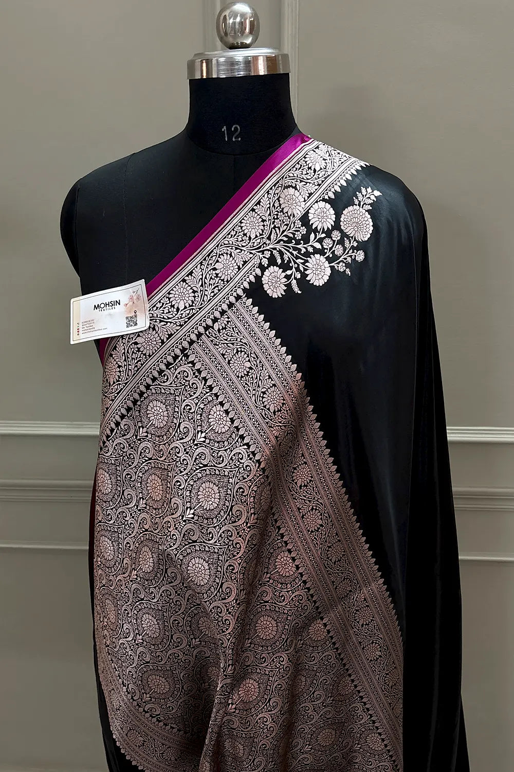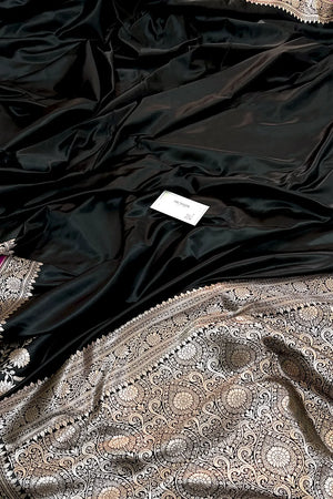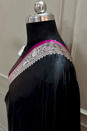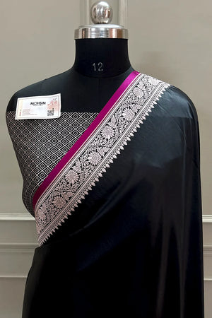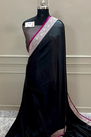 This Black Zari Border Katan Silk Banarasi Saree showcases exquisite craftsmanship with its rich zari border and fine silk texture, offering a perfect blend of tradition and elegance for formal events and festive celebrations.