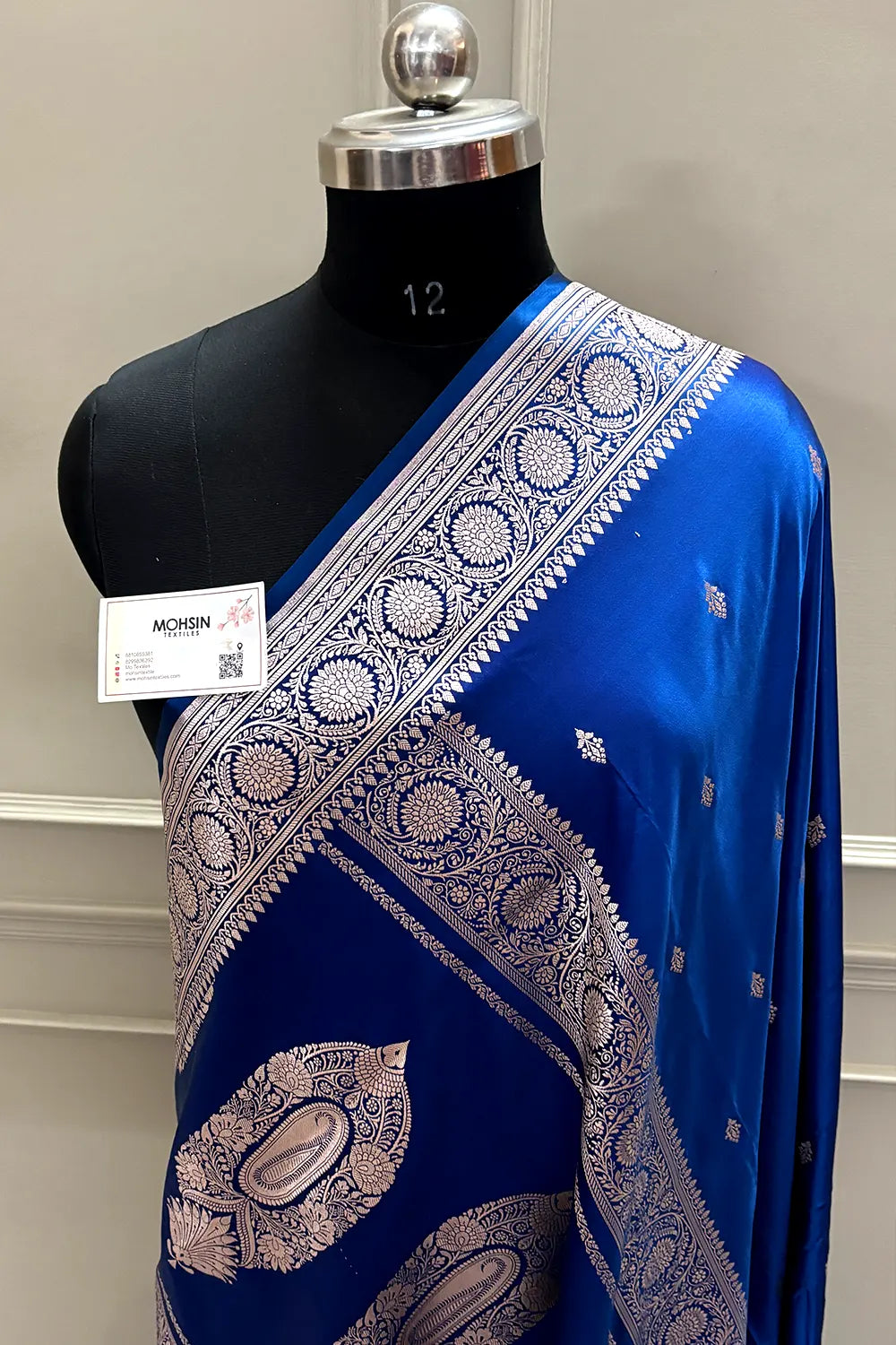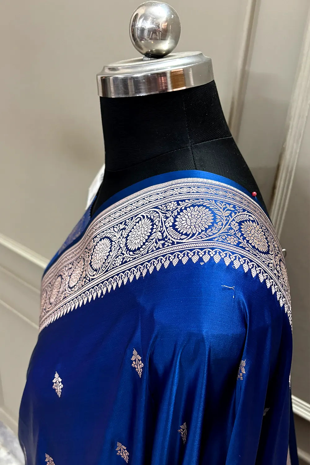 Loomwoven with lustrous katan silk and intricate zari threadwork, this Banarasi saree exemplifies traditional craftsmanship. The rich blue hue pairs beautifully with gold accents, creating an elegant drape perfect for celebrations and formal occasions.