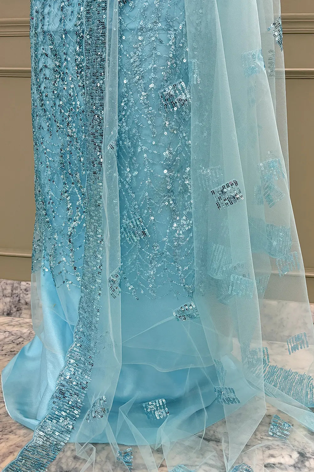 The Firozi Sequence Embroidery Net Salwar Suit combines lightweight net fabric with exquisite sequence embroidery, delivering elegance and comfort. Ideal for special events, its refined craftsmanship ensures a graceful silhouette with a subtle, sophisticated sparkle.