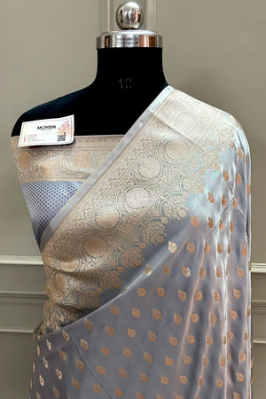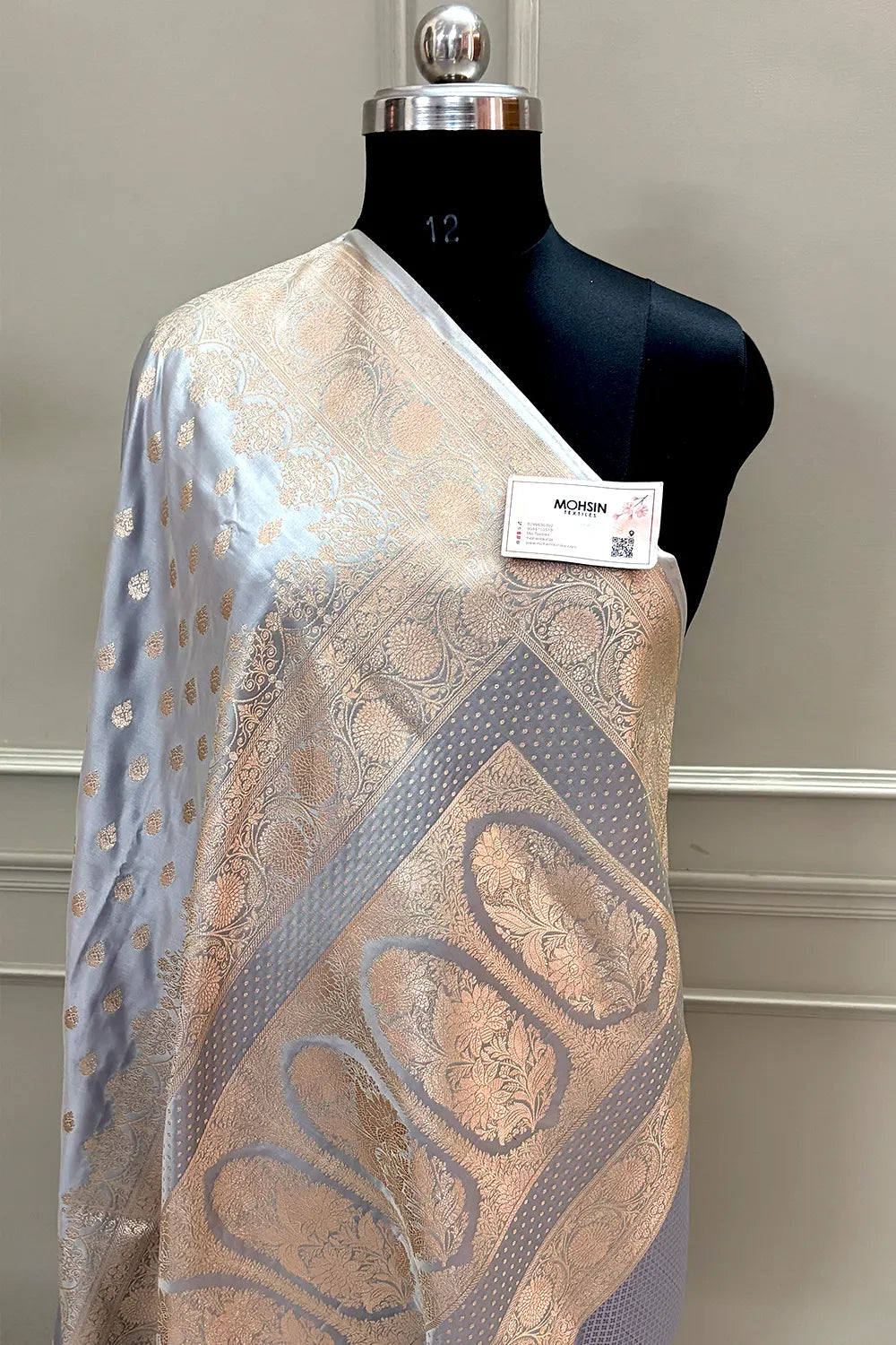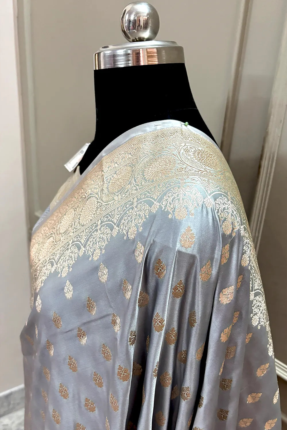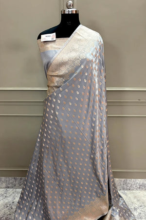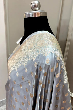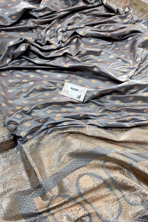 This elegant Grey Golden Zari Katan Silk Banarasi Saree is crafted with luxurious silk and adorned with intricate zari detailing. Perfect for special occasions, this saree offers a timeless and regal look for the wearer. Exude grace and sophistication with this traditional saree.