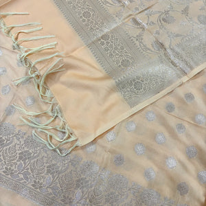 Experience understated luxury with this loomcrafted Banarasi suit in light peach, featuring traditional kiyari motifs woven into sumptuous satin silk. A testament to heritage artistry, perfect for those who value authentic craftsmanship and timeless elegance