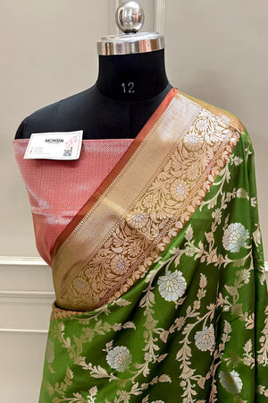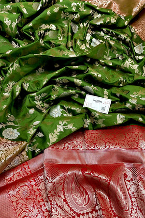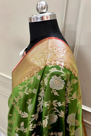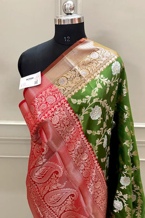 Mehendi and Red Golden Zari Banarasi Silk Saree