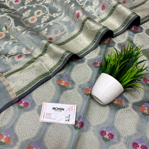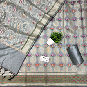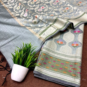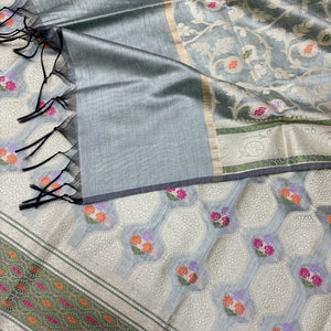 Neutral silk suit showcasing delicate resham in versatile mint. Traditional Banarasi craftsmanship ensures superior fabric integrity and elegant movement, offering timeless sophistication for any formal occasion.