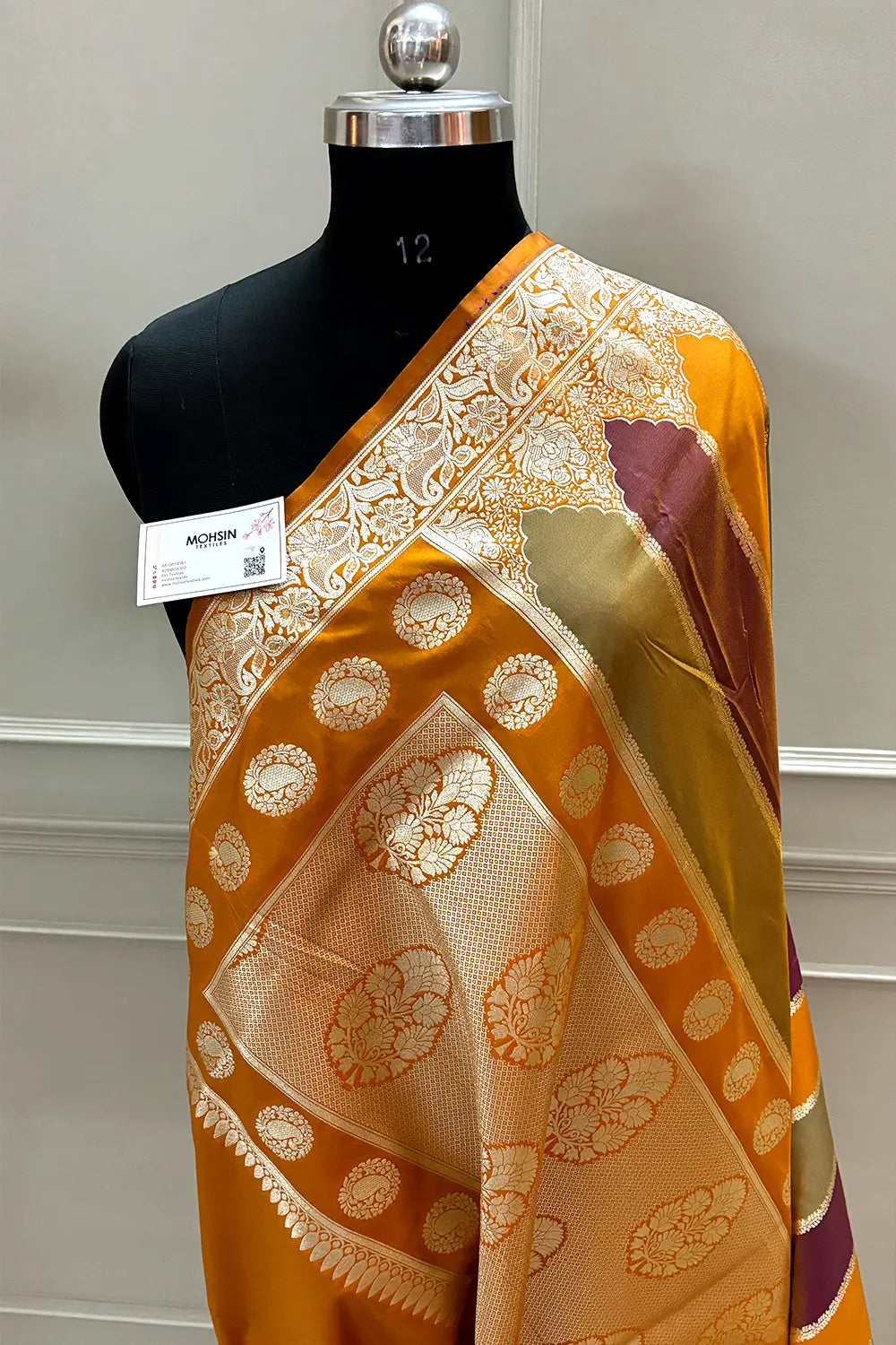 Vibrant mustard orange rangkaat weave on premium katan silk showcases traditional Banarasi artistry. The intricate pattern work and luxurious fabric create striking visual depth, perfect for making a bold statement at weddings and celebrations.
