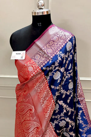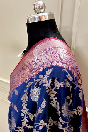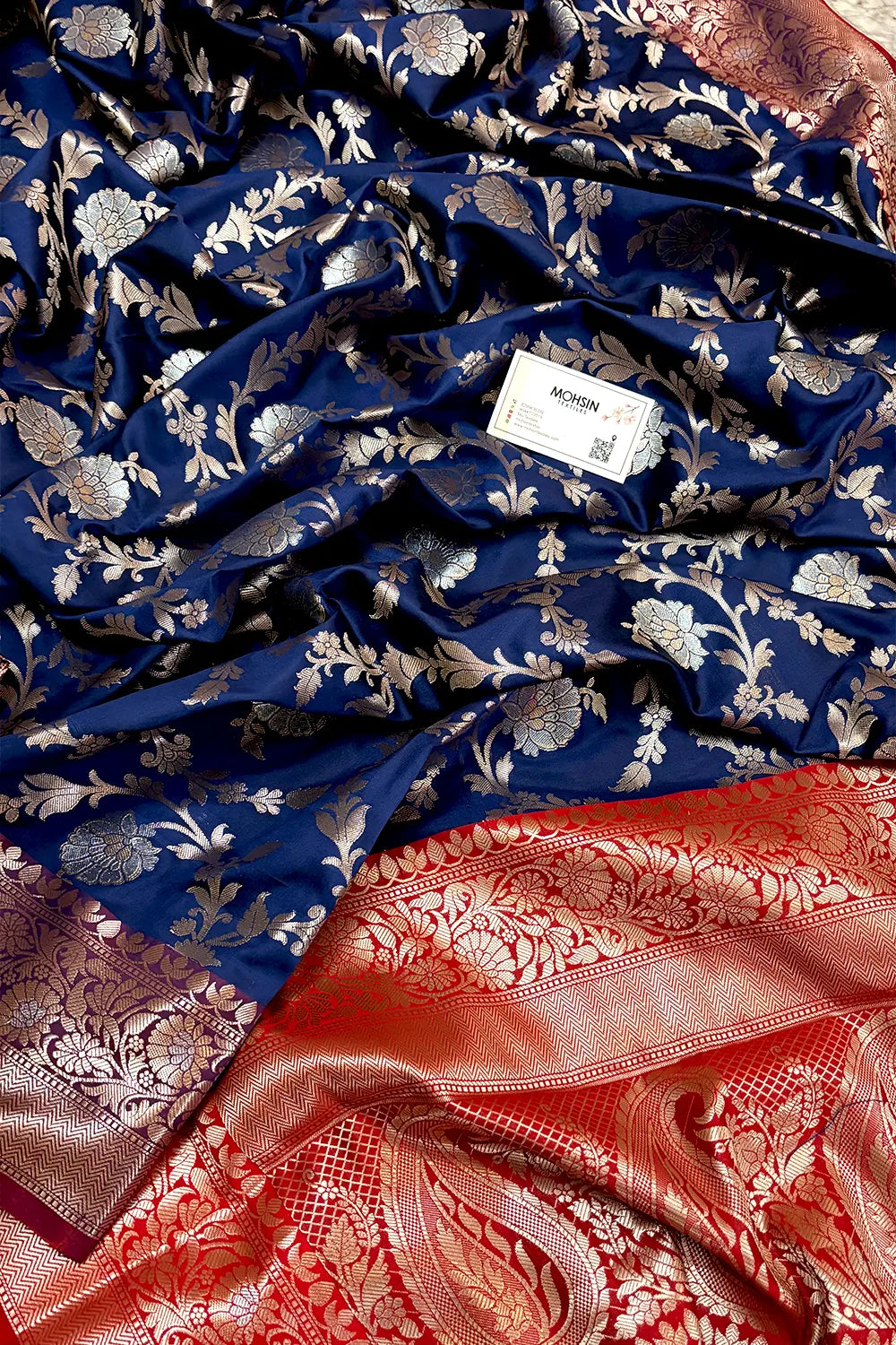 Navy Blue and Red Golden Zari Banarasi Silk Saree