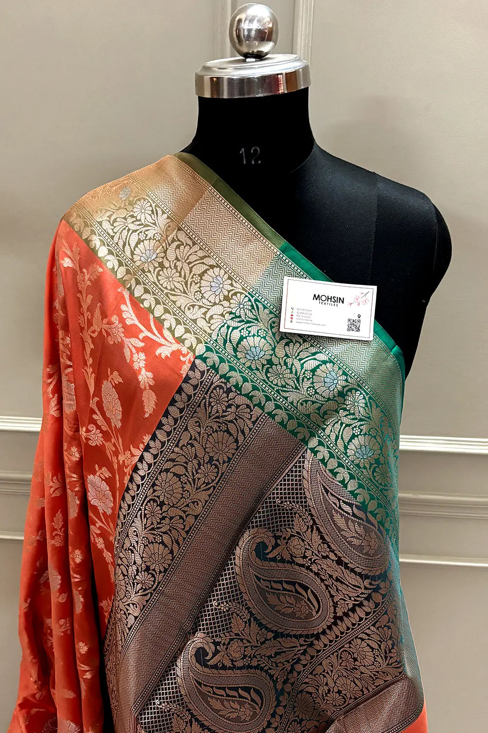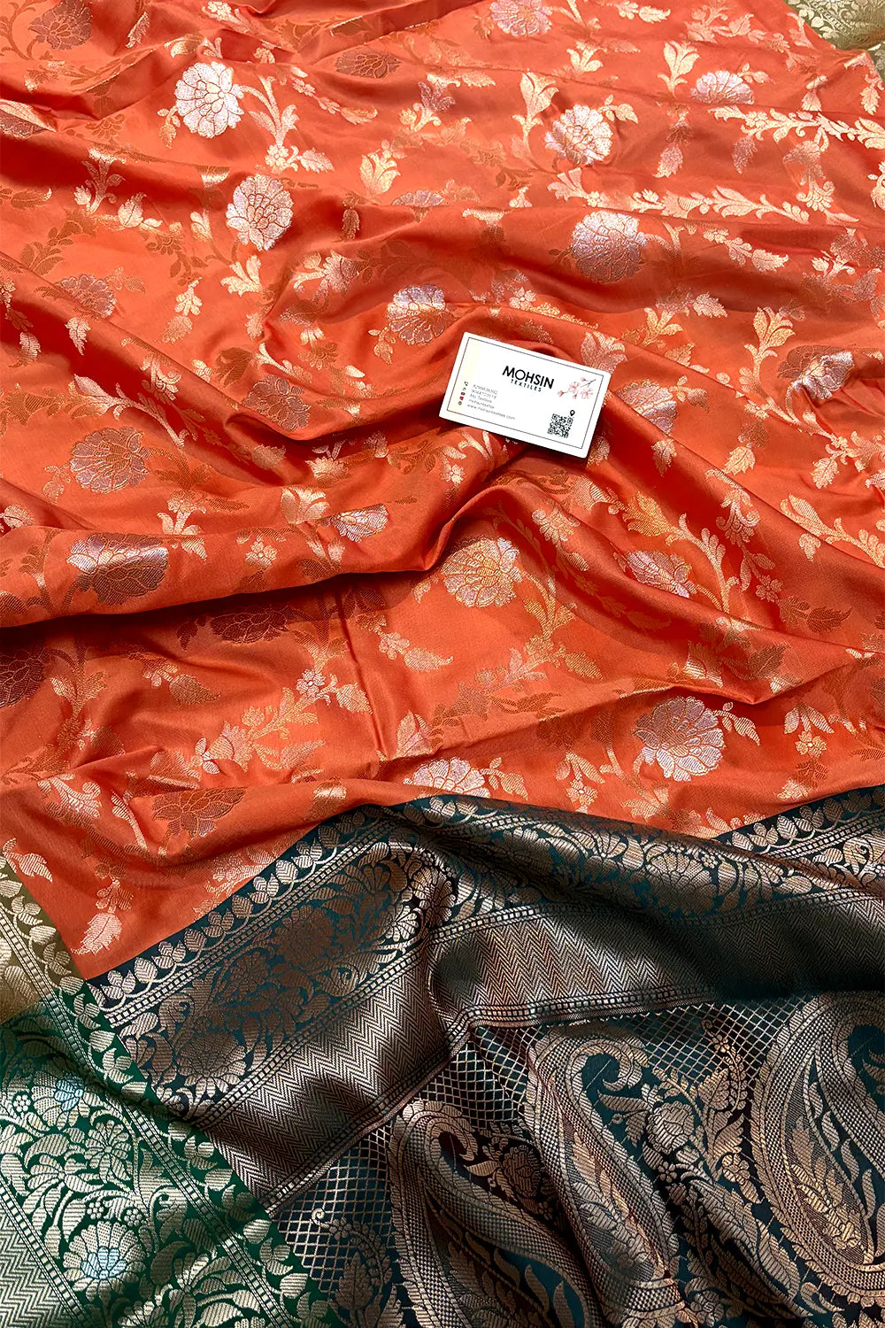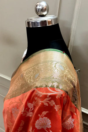 Orange and Bottle Green Zari Banarasi Silk Saree