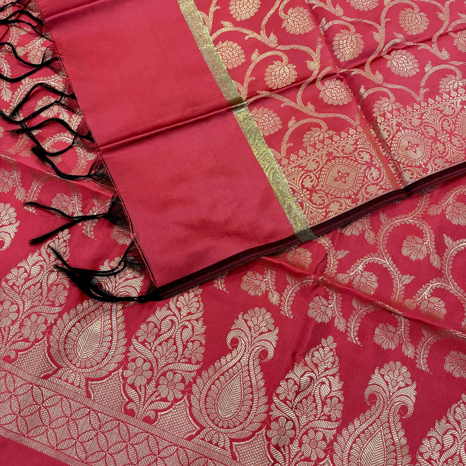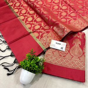 This Peach Kalgha Jaal Satin Silk Banarasi Suit features intricate weaving that highlights traditional craftsmanship. The smooth satin silk fabric offers comfort and elegance, making it ideal for festive occasions and formal events where refined style is essential.