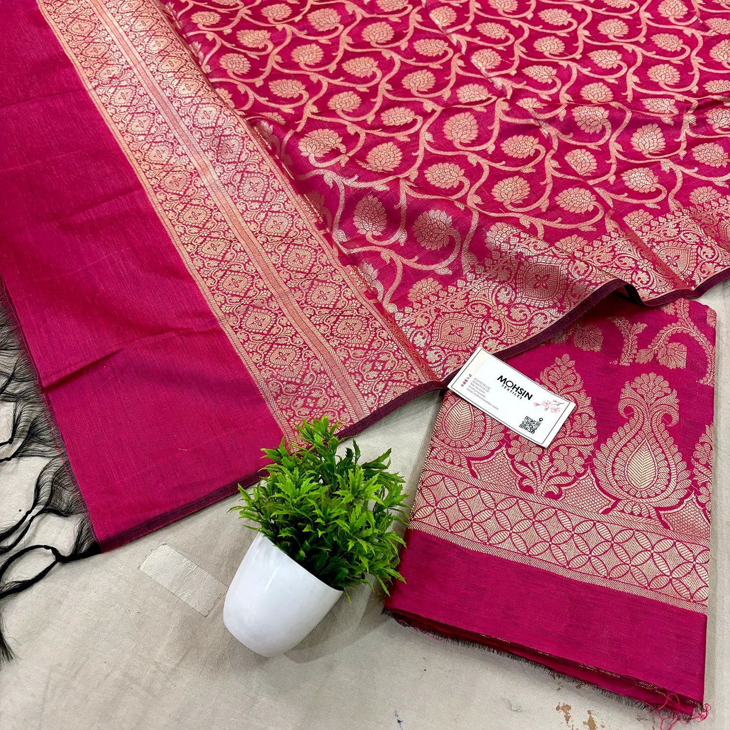This Pink Golden Zari Banarasi Silk Suit is a truly exquisite piece of clothing. Made from high-quality Banarasi silk and adorned with intricate golden zari work, it is a luxurious and elegant addition to any wardrobe. Its rich peach color is perfect for special occasions and its beautiful design is sure to turn heads.