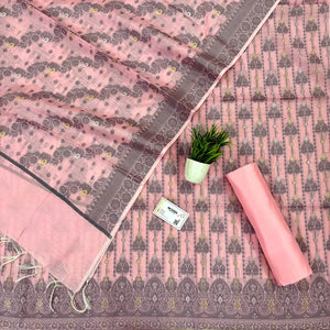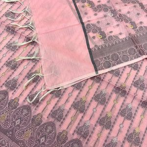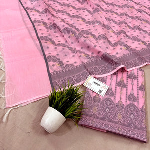 This Pink Resham Zari Banarasi Silk Suit features exquisite zari and resham on premium silk, blending traditional craftsmanship with elegant design. Its refined beige tone ensures versatility, making it ideal for formal events and cultural celebrations.
