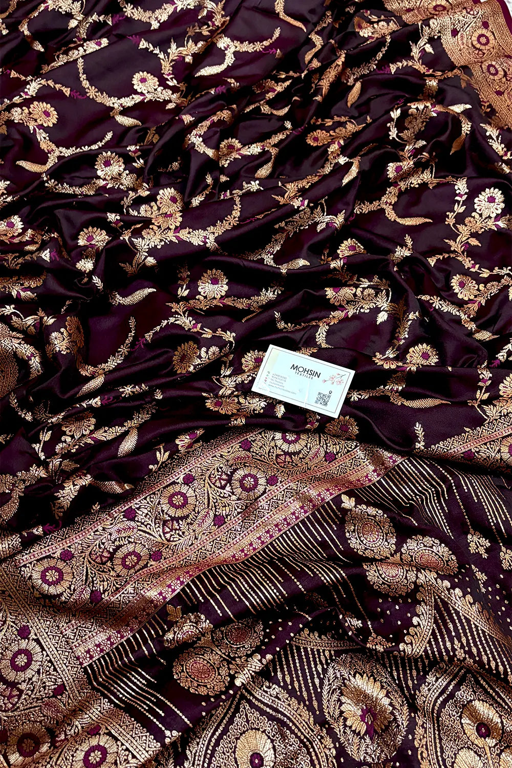 This Purple Golden Zari Katan Silk Banarasi Saree showcases exquisite craftsmanship with rich zari work on premium Katan silk. Its elegant design and luxurious texture make it perfect for traditional occasions, ensuring a timeless and sophisticated look.