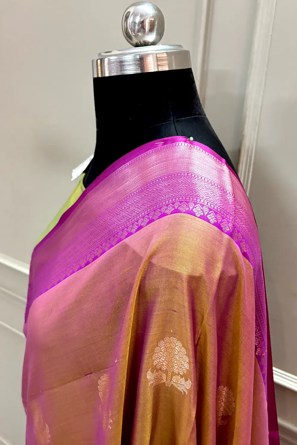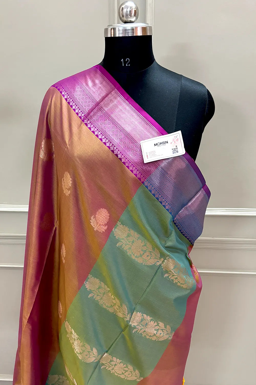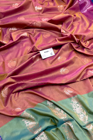 This Rust and Green Golden Zari Banarasi Silk Saree features exquisite golden zari detailing woven into premium silk fabric. The elegant combination of lavender and pink hues enhances its traditional appeal, making it ideal for weddings and festive occasions. Expertly crafted, it offers a luxurious drape and timeless sophistication.