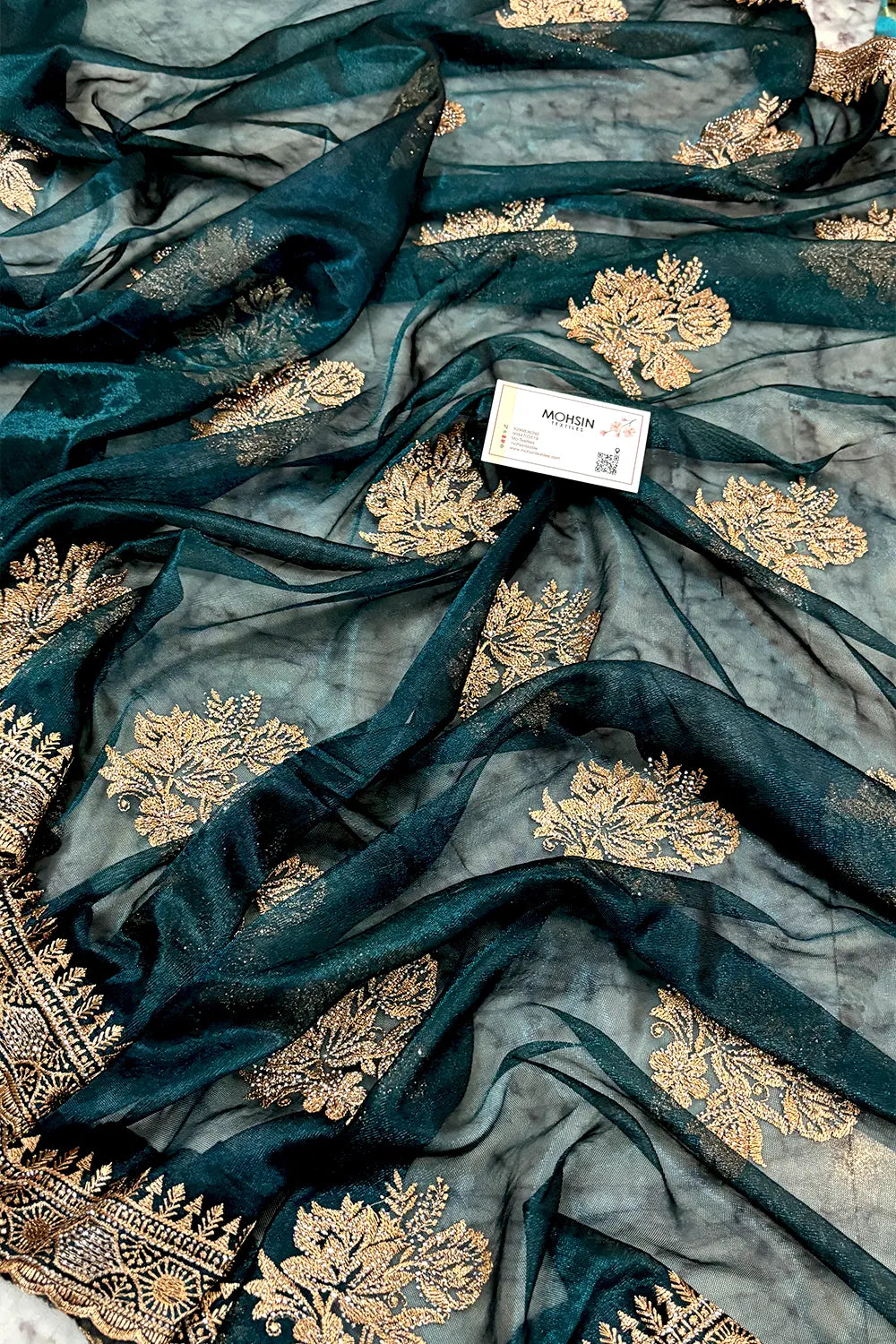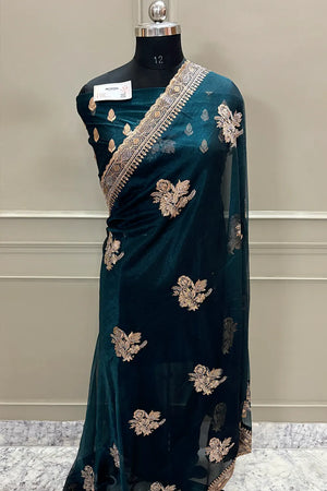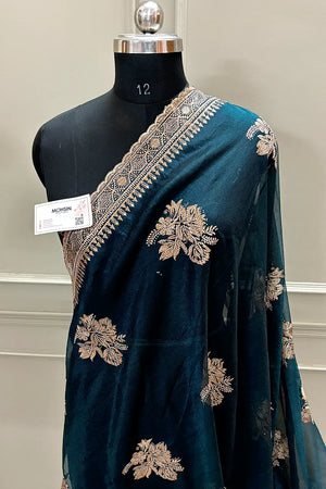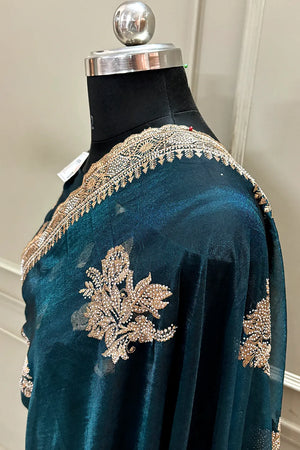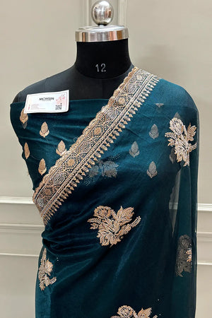 Teal Embordiery Siroski Work Silk Saree