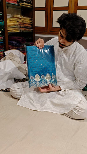 Expertly crafted from premium, lightweight Katan Silk, this elegant teal Banarasi Saree boasts a smooth and luxurious feel. Adorned with intricate Siroski Stone detailing, this saree exudes a timeless beauty that will leave you feeling confident and sophisticated on any occasion.