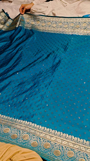 Teal Plain Siroski Stone Katan Silk Banarasi Saree