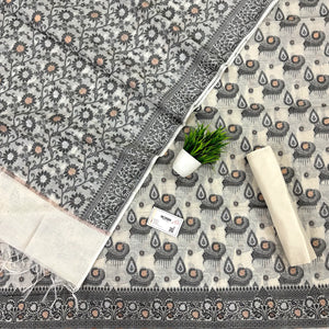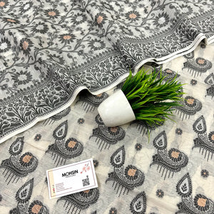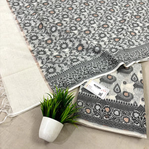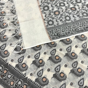 This White Resham Zari Banarasi Silk Suit features exquisite zari and resham on premium silk, blending traditional craftsmanship with elegant design. Its refined beige tone ensures versatility, making it ideal for formal events and cultural celebrations.