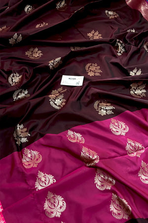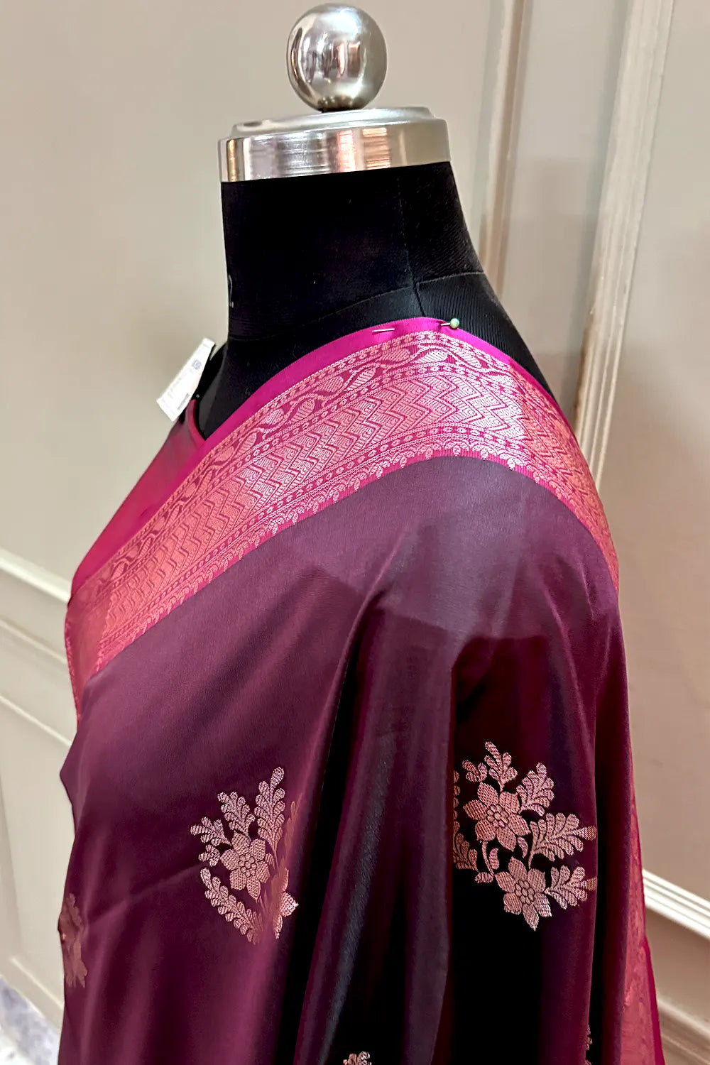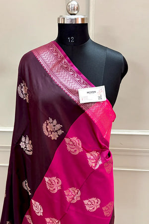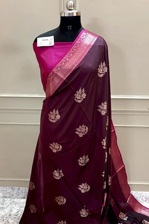 This Wine and Pink Golden Zari Banarasi Silk Saree features exquisite golden zari detailing woven into premium silk fabric. The elegant combination of lavender and pink hues enhances its traditional appeal, making it ideal for weddings and festive occasions. Expertly crafted, it offers a luxurious drape and timeless sophistication.