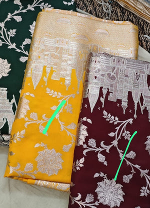 This Yellow Ganga Ghat Katan Silk Banarasi Suit is a luxurious and elegant addition to any wardrobe. Crafted from high-quality katan silk, it features intricate Banarasi weaving and a stunning bottle green color. Perfect for special occasions, this suit offers both comfort and style.
