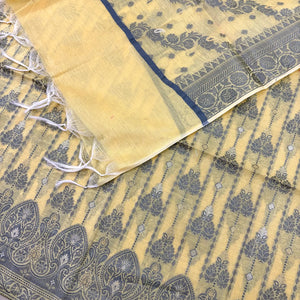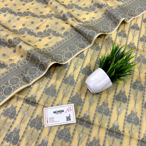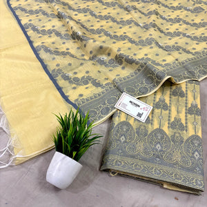 This Yellow Resham Zari Banarasi Silk Suit features exquisite zari and resham on premium silk, blending traditional craftsmanship with elegant design. Its refined beige tone ensures versatility, making it ideal for formal events and cultural celebrations.