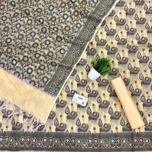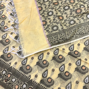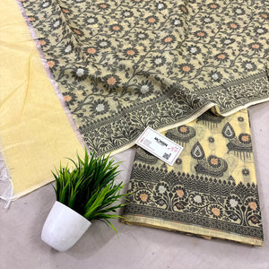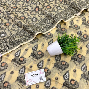 This Yellow Resham Zari Banarasi Silk Suit features exquisite zari and resham on premium silk, blending traditional craftsmanship with elegant design. Its refined beige tone ensures versatility, making it ideal for formal events and cultural celebrations.