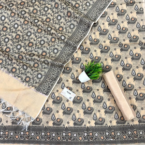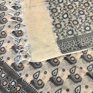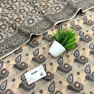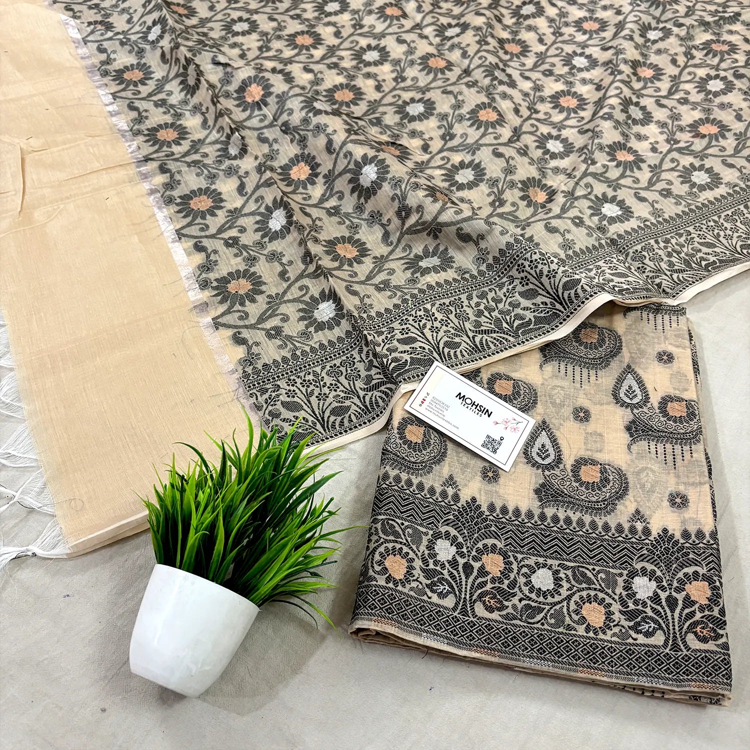 This Beige Resham Zari Banarasi Silk Suit features exquisite zari and resham on premium silk, blending traditional craftsmanship with elegant design. Its refined beige tone ensures versatility, making it ideal for formal events and cultural celebrations.